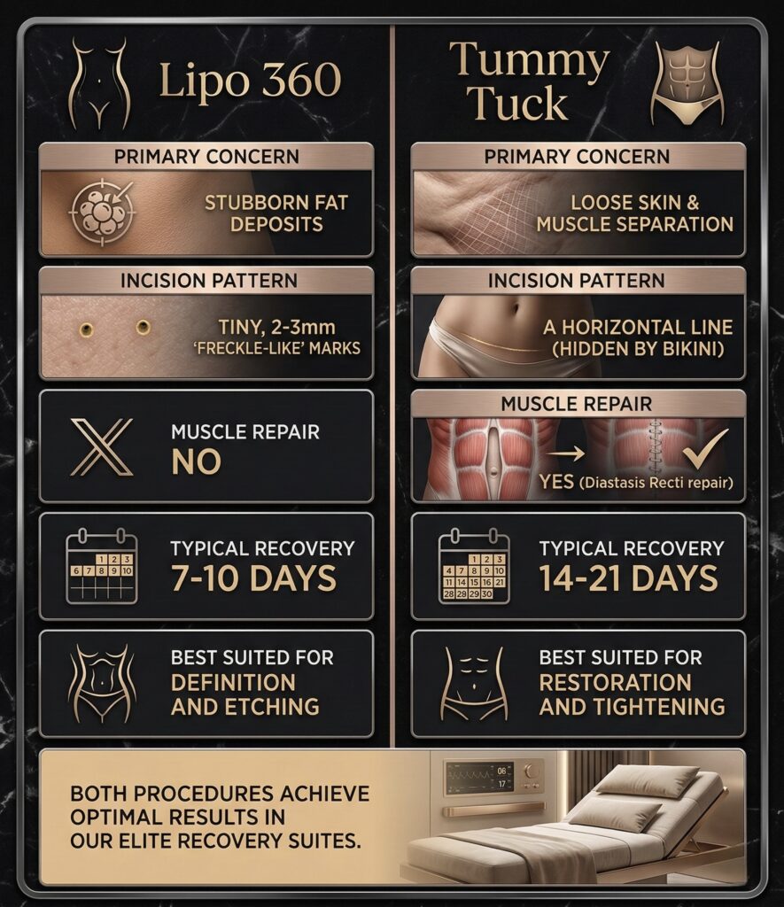 A Tummy Tuck is a reconstructive procedure. While Lipo 360 removes fat, a Tummy Tuck addresses the “canvas” (the skin) and the “frame” (the muscles).